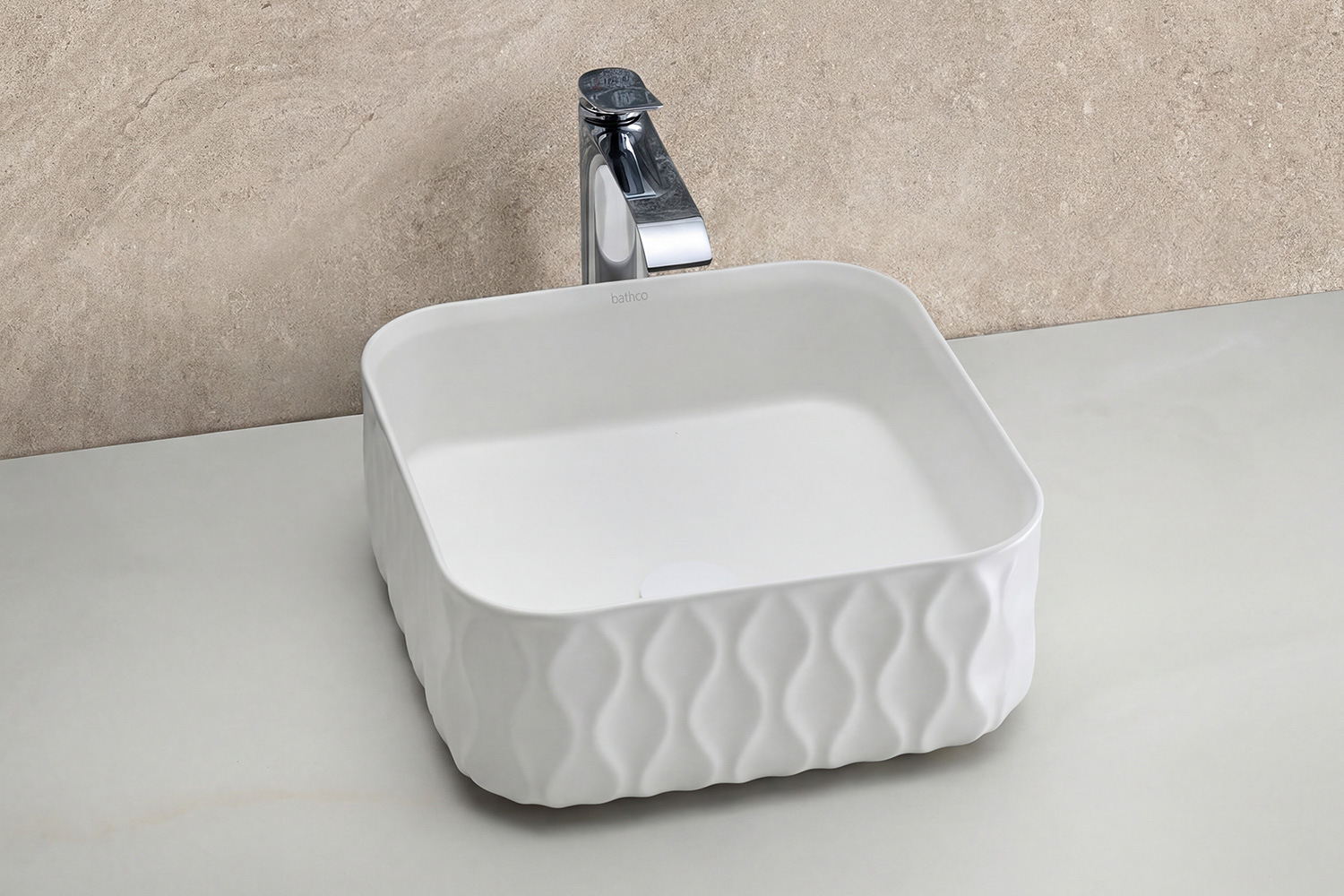 角の丸みを活かしたスクエアフォルムは、モダンさとやさしさを兼ね備え、日常の洗面空間に静かな美を添えます。