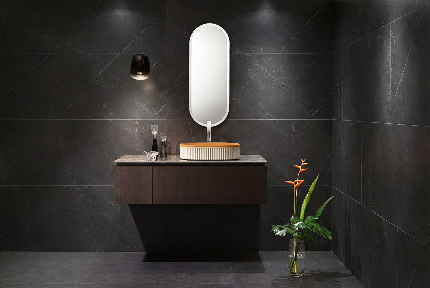 光が当たるたびに艶やかに輝く釉薬の質感が、洗面空間にぬくもりと気品を与え、