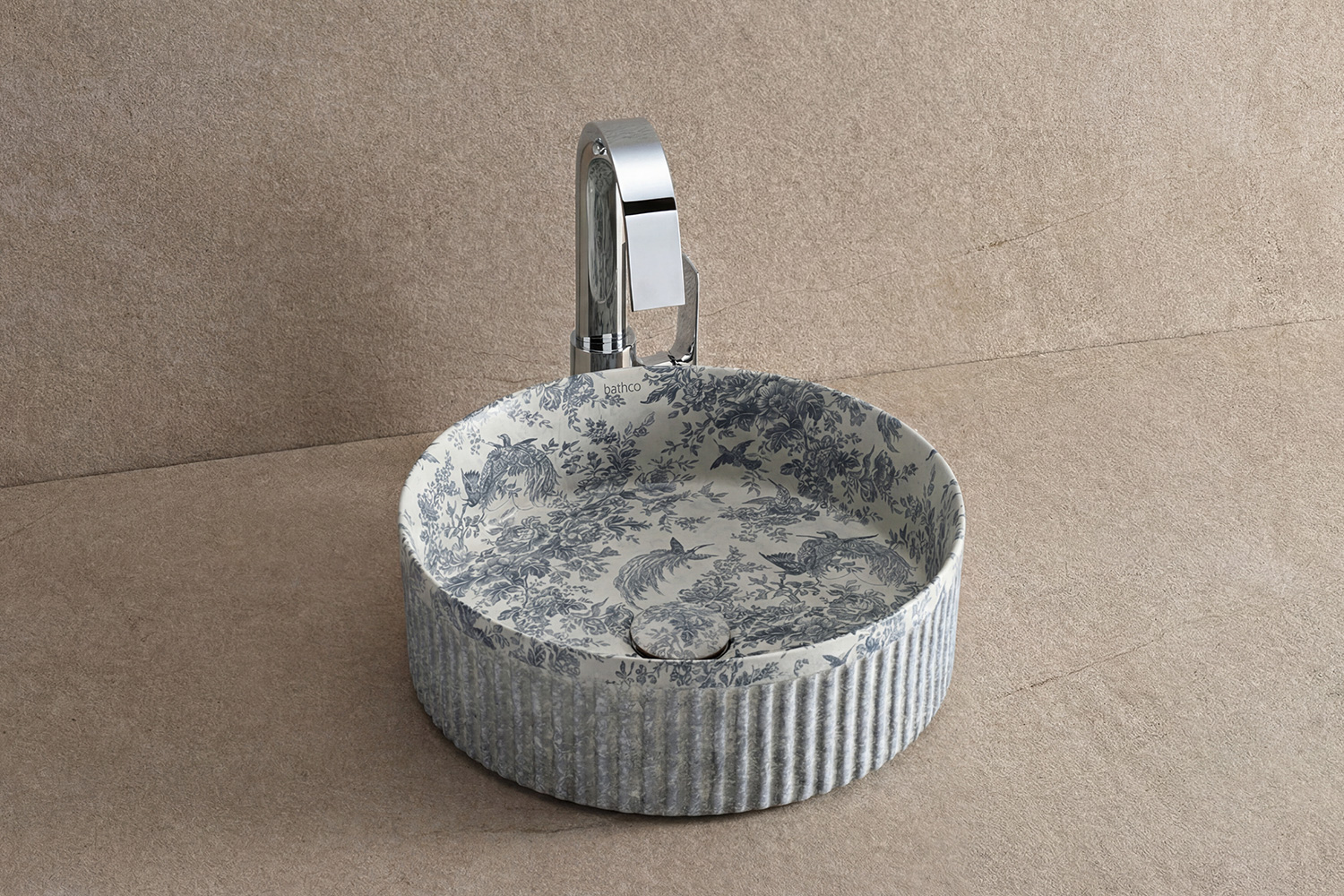 クラシックなトワル・ド・ジュイ柄に描かれた花鳥風月の情景が、洗面空間に繊細で詩的な趣をもたらします。