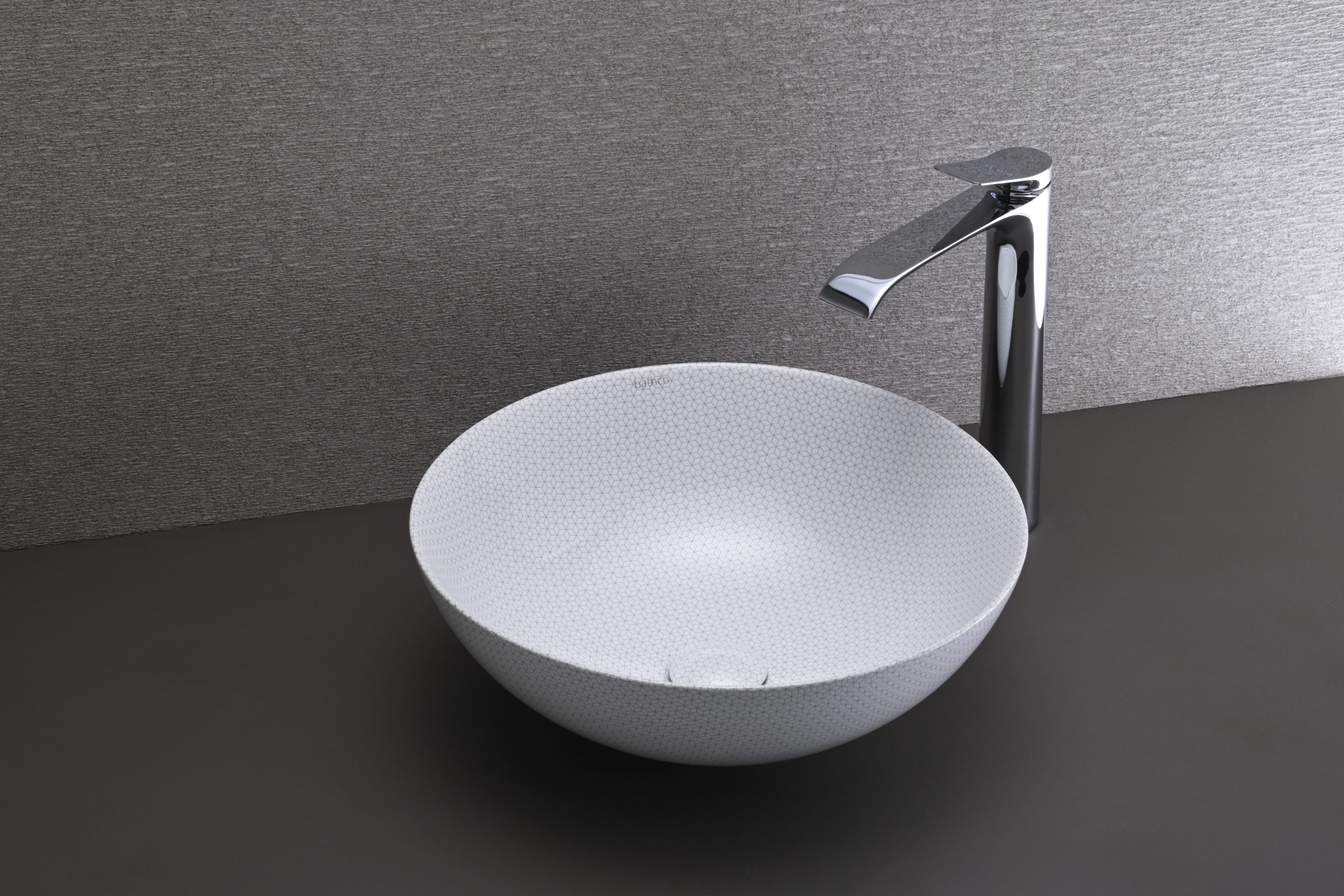 白磁の上に無数の六角形が緻密に並び、まるで建築的なリズムを奏でるような表情を見せます。