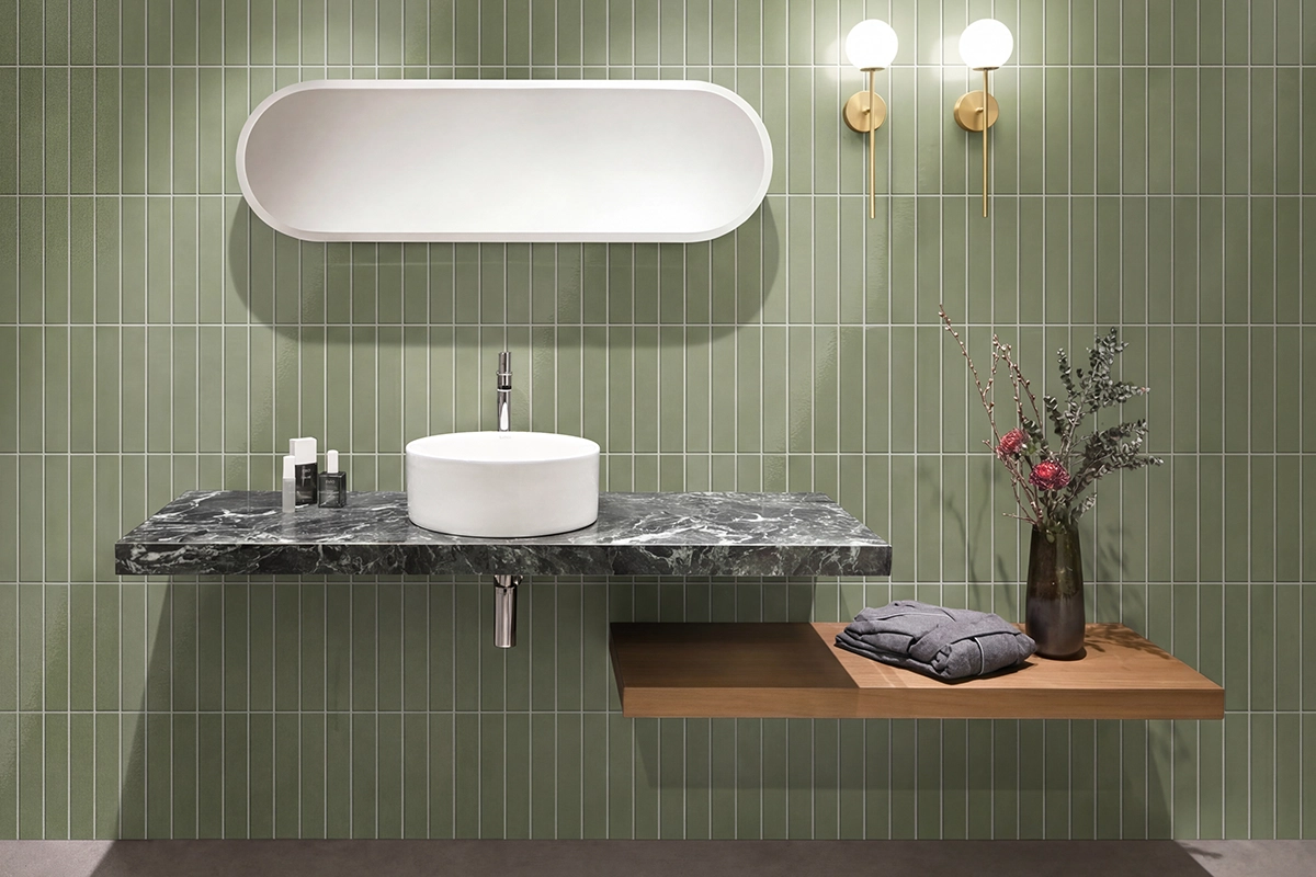 均整のとれた円形デザインが、洗面空間に安定感と清潔感をもたらします。