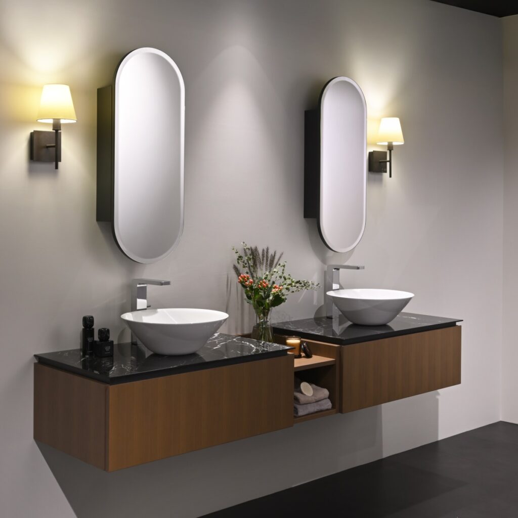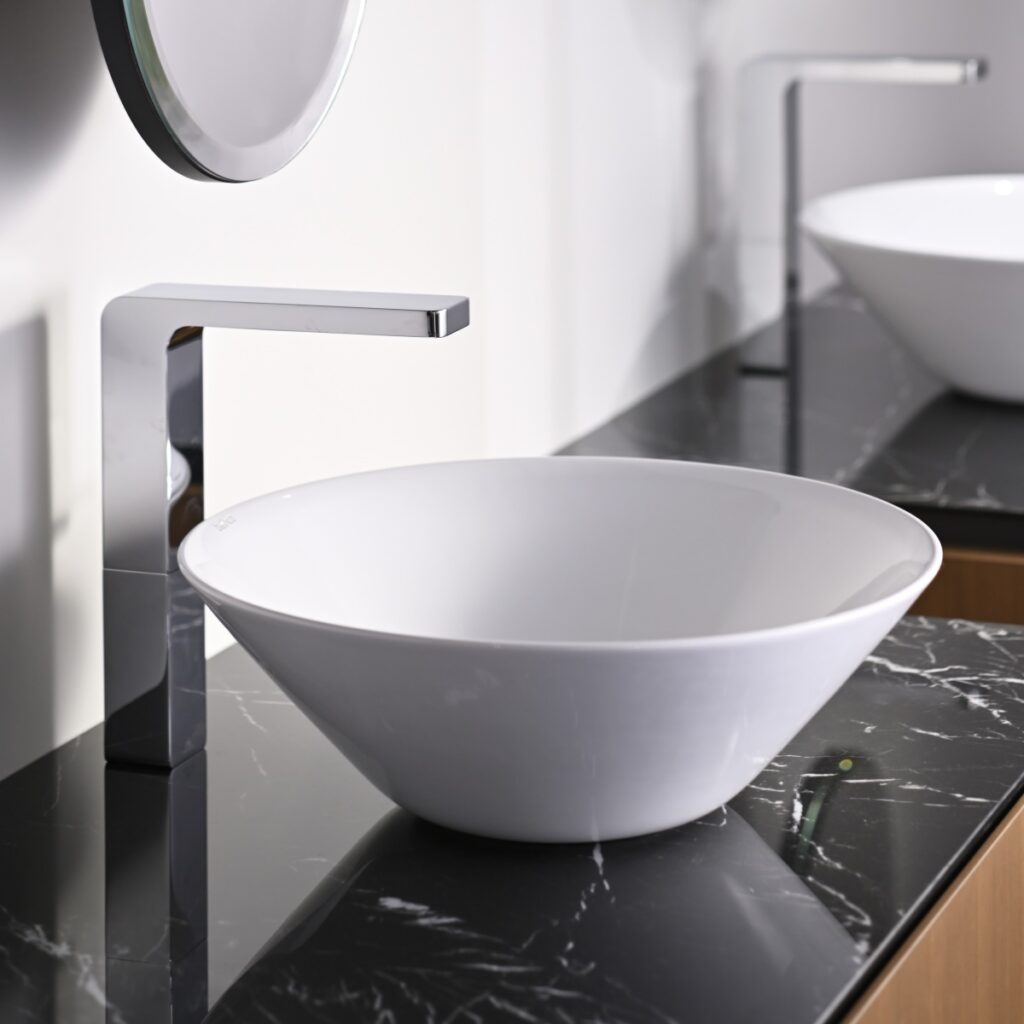 開放感のある広がりを見せるフォルムが、洗面空間に軽やかさと優雅さを添えます。
